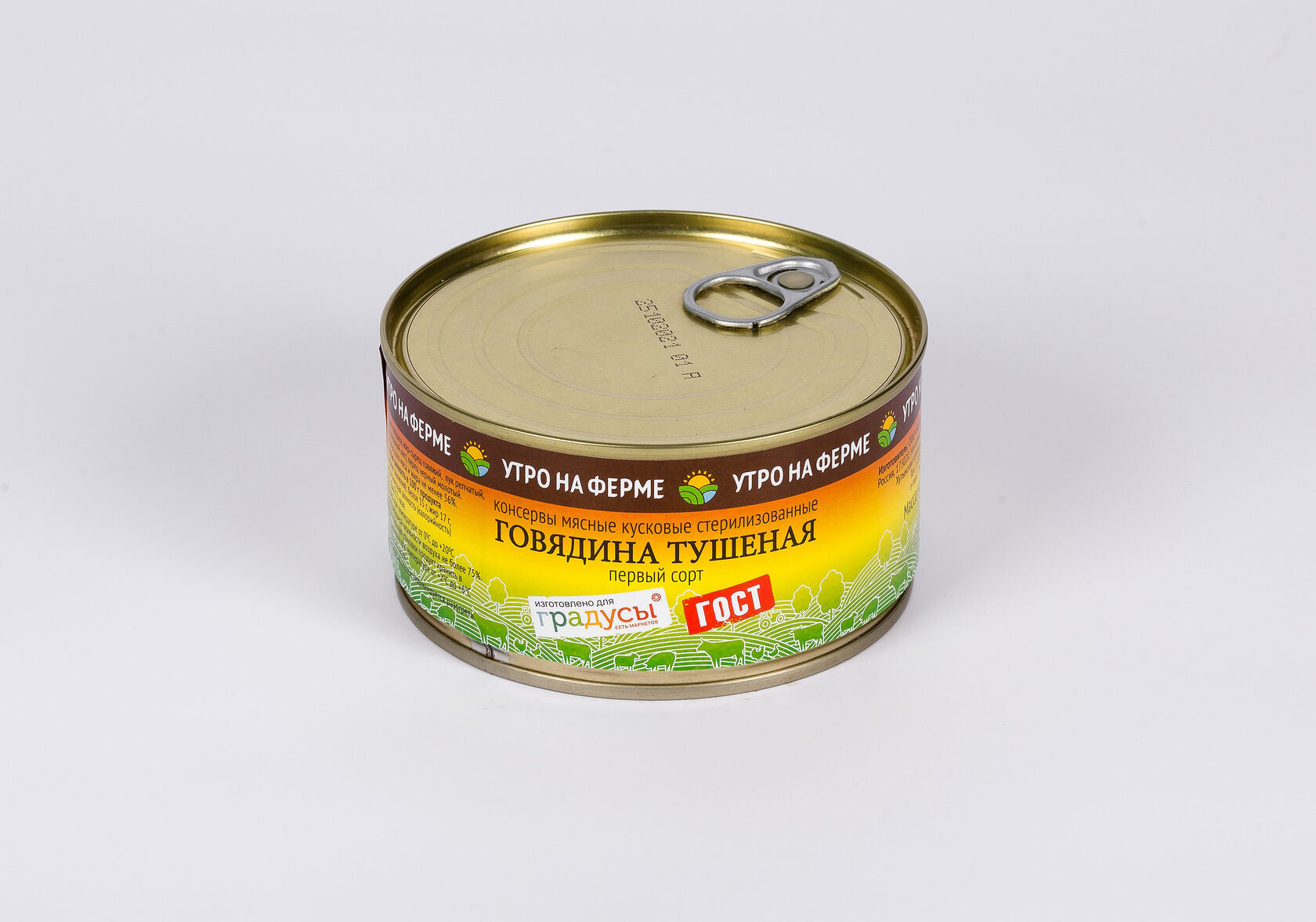 Говядина тушеная в/с "Утро на ферме" ГОСТ 325г ж/б, в упаковке -18 шт, срок годности 3 года, температура хранения от 0 до +20