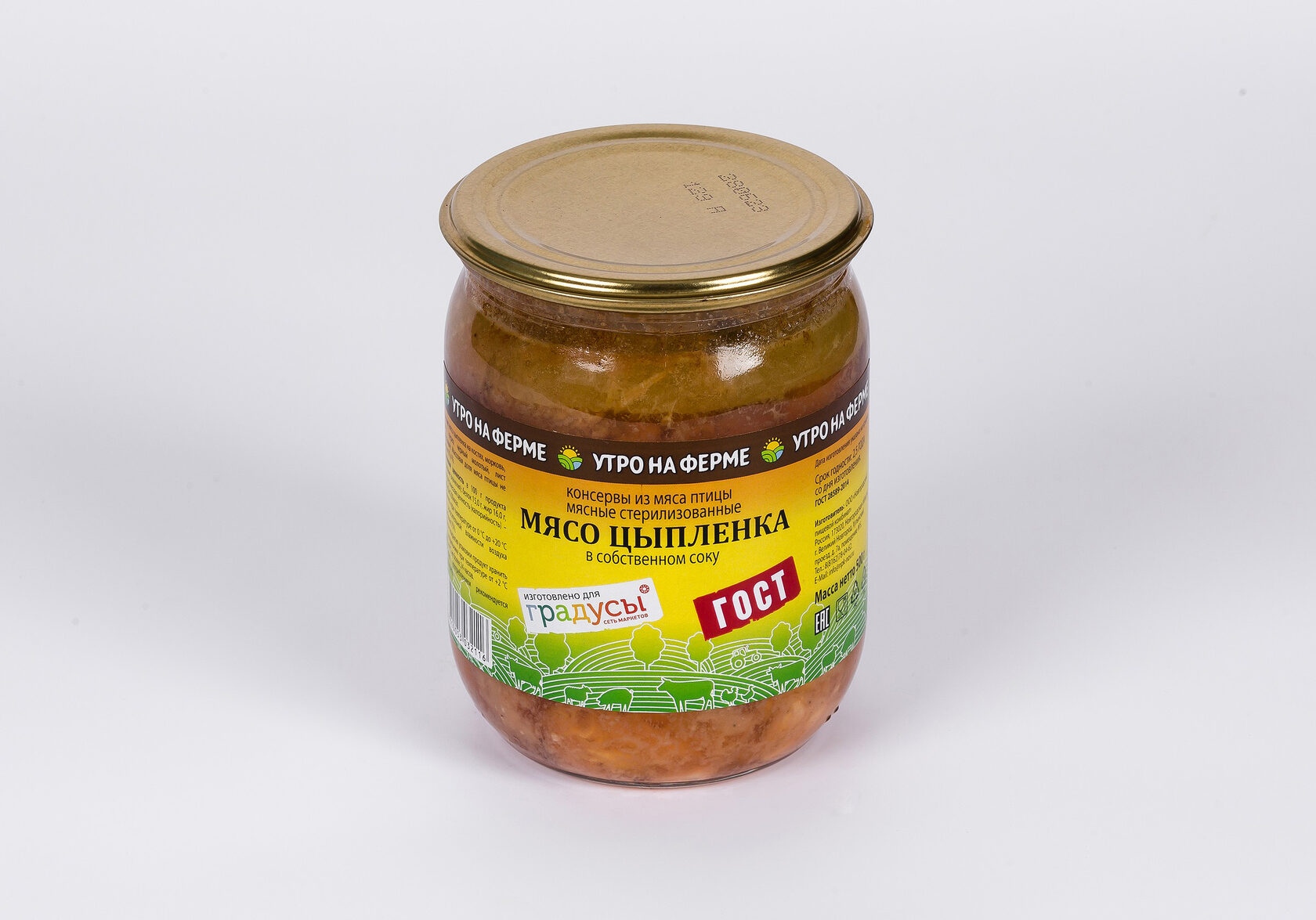 Мясо цыпленка в собственном соку "Утро на ферме" ГОСТ 500г с/б, в упаковке -8 шт, срок годности 3 года, температура хранения от 0 до +20